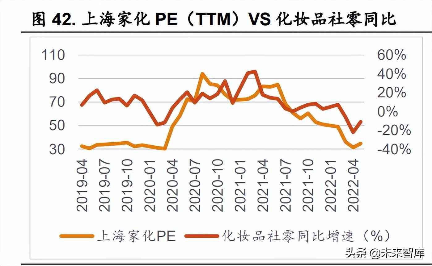 第二,对品牌商来说,行业整体估值走向与化妆品社会零售额增速相关 性较高。化妆品社零月度同比增速可以一定程度上衡量行业短期的景气度, 品牌商的估值普遍随行业短期景气度的变化而呈现同涨同跌的形态。例如, 自 2021 年下半年以来,化妆品月度社零同比未延续前期两位数的高增速, 并开始骤降至个位数甚至负数,多数个股的估值也随之大幅回调。