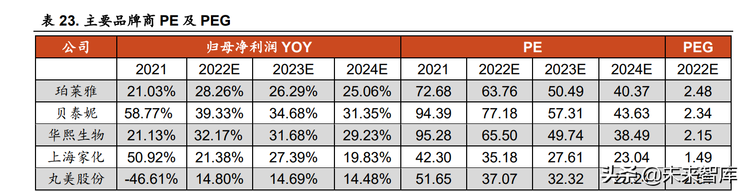 PEG 角度:品牌商 PEG 的区间范围为 1.5-2.5X。组织架构高效,盈利 能力稳定的公司通常 PEG 水平较高,比如珀莱雅。部分景气细分赛道拥有 较明显的研发壁垒或背书壁垒,代工普及化和营销多元化背景下,竞争格局 优于的传统化妆品赛道,存在估值溢价,通常 PEG 水平较高。比如贝泰妮所 处的敏感肌护肤赛道增速高,且顾客复购率高,皮肤科医生背书打造薇诺娜 品牌独特的竞争壁垒;华熙生物拥有玻尿酸研发壁垒,主打“玻尿酸+”护肤 概念,“成分党”崛起使其功能性护肤品业务发展壮大。上海家化除经营美容 护肤产品外,个护和母婴产品营收占比也较高,PEG 水平低于化妆品业务营 收占比较高的公司。丸美股份过去 2 年归母净利润均同比下滑,PEG 水平不 具备参考价值,PE 估值水平未超过 40-60X 估值上限。