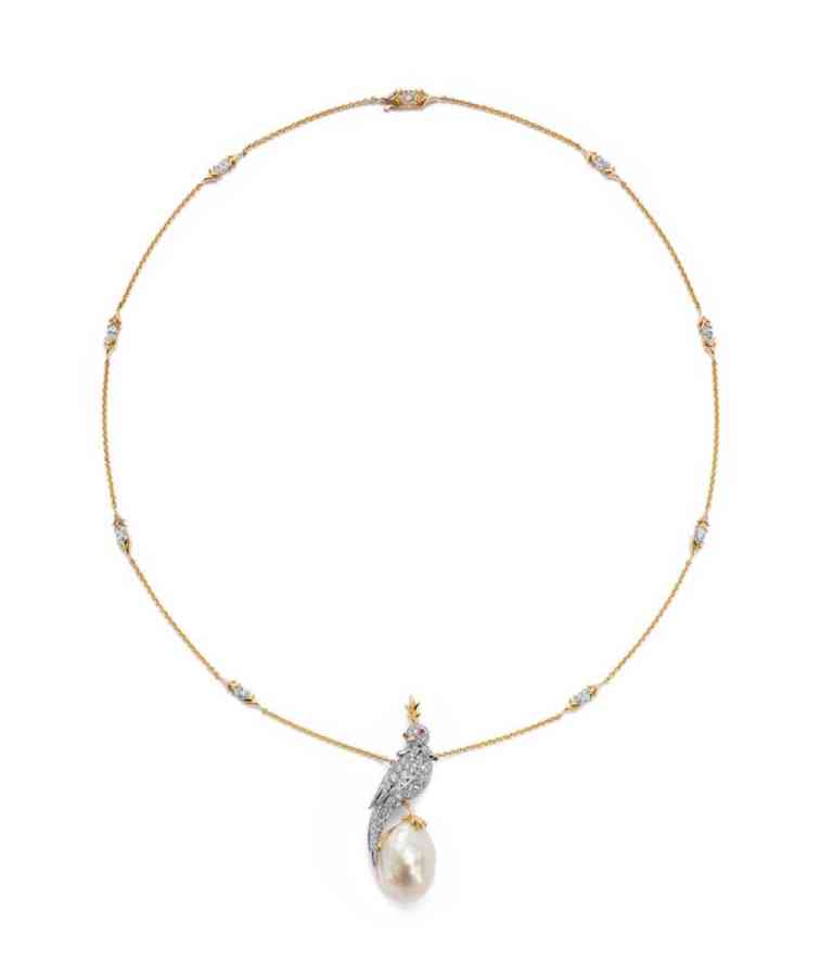 Tiffany & Co. 蒂芙尼Schlumberger™高级珠宝系列铂金及18K黄金镶嵌一颗重逾30克拉的白色巴洛克天然海水珍珠,钻石及粉色蓝宝石Bird on a Pearl吊坠