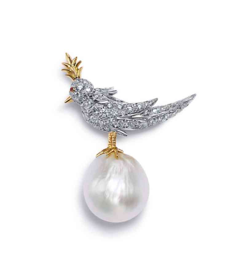 Tiffany & Co. 蒂芙尼Schlumberger™高级珠宝系列铂金及18K黄金镶嵌一颗重逾26克拉的白色纽扣形天然海水珍珠,钻石及粉色蓝宝石Bird on a Pearl胸针