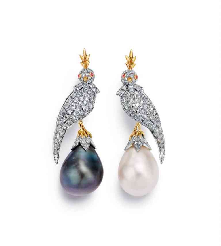Tiffany & Co. 蒂芙尼Schlumberger™高级珠宝系列铂金及18K黄金镶嵌一颗重逾14克拉的白色水滴形天然海水珍珠,一颗重逾17克拉的深灰色水滴形天然海水珍珠,钻石及粉色蓝宝石Bird on a Pearl耳环
