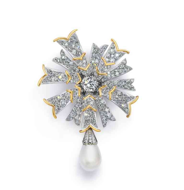 Tiffany & Co. 蒂芙尼Schlumberger™高级珠宝系列铂金及18K黄金镶嵌一颗重逾16克拉的奶油色水滴形天然海水珍珠及钻石缎带造型胸针