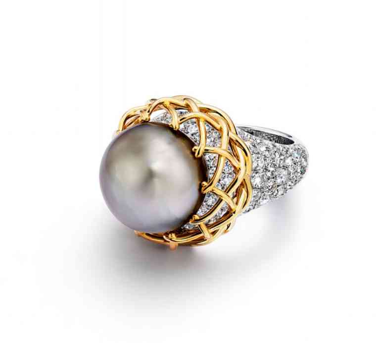 Tiffany & Co. 蒂芙尼Schlumberger™高级珠宝系列铂金及18K黄金镶嵌一颗重逾15克拉的灰色纽扣形天然海水珍珠及钻石Pavé Wire Wrap戒指