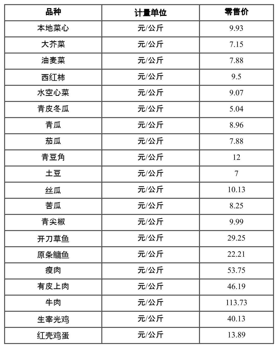 11月21日,广州市发改委公布全市菜篮子平均零售价如下: