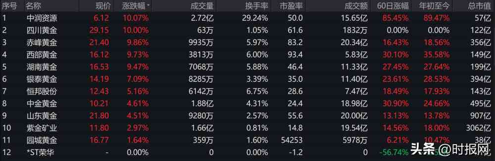 具体来看,中润资源(000506)、四川黄金(001337)涨停,赤峰黄金(600988)、西部黄金(601069)、湖南黄金(002155)涨超9%,银泰黄金(000975)、恒邦股份(002237)等涨超5%,剩余个股跟涨。其中,次新股四川黄金上市12日录得12板。