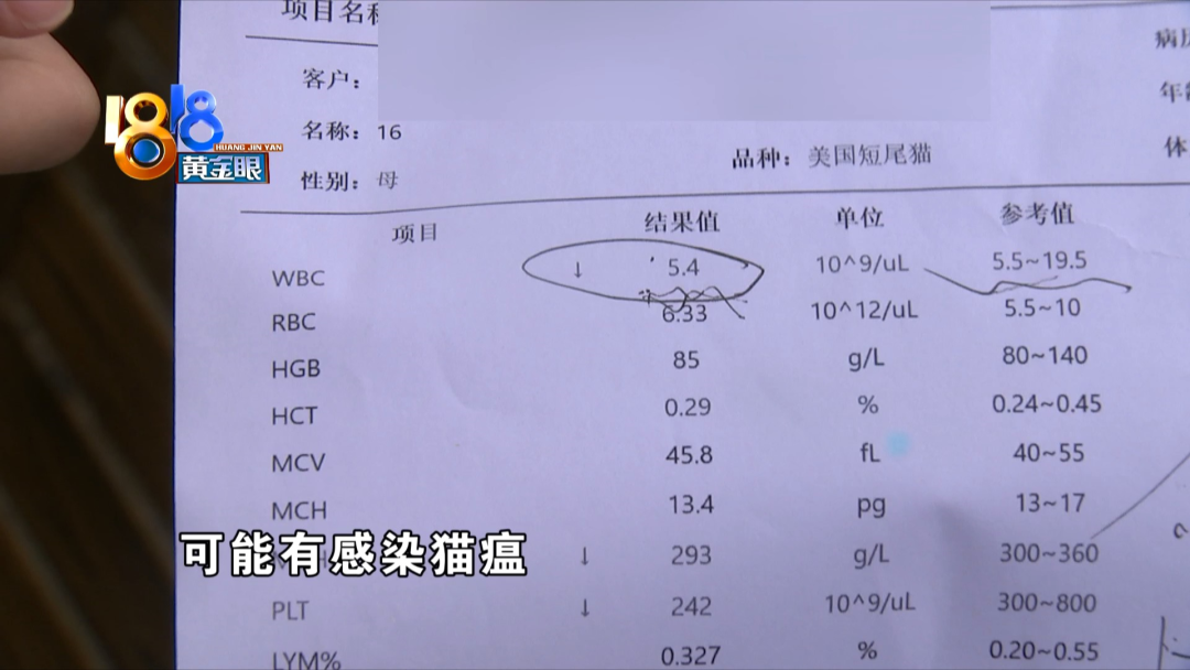 小吕:“可能会猫传腹,会变异这种情况,还有血常规显示白血球比较低,可能有感染猫瘟,这只是可能,因为现在还没症状出来,猫瘟是有潜伏期的,目前在观察阶段,我也给它配了一些宠物医院的抑制素。”