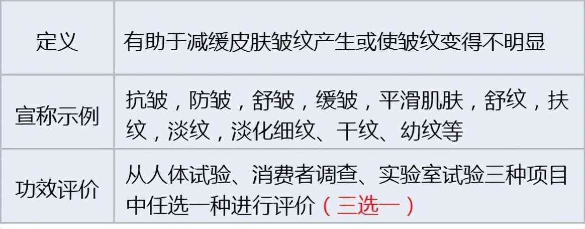皱纹是人体皮肤生理特征,只可延缓产生和淡化,但不能根除,所以不能使用祛皱、去皱、除皱等夸大性功效宣称。