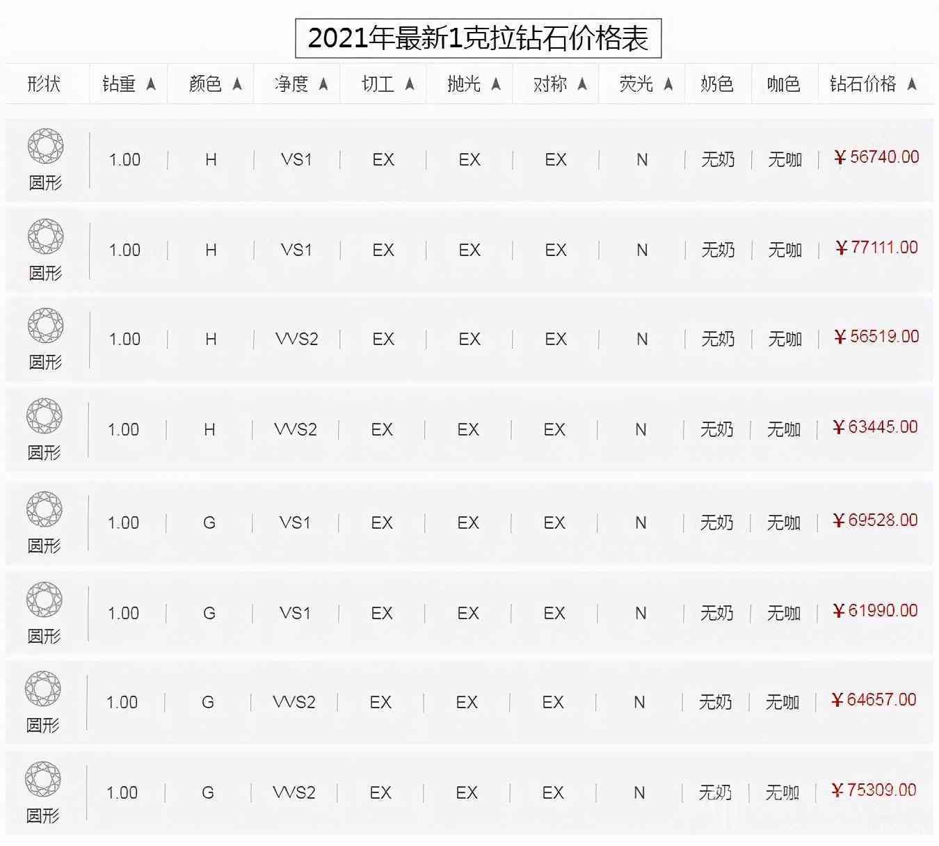 2021年1克拉钻石价格表