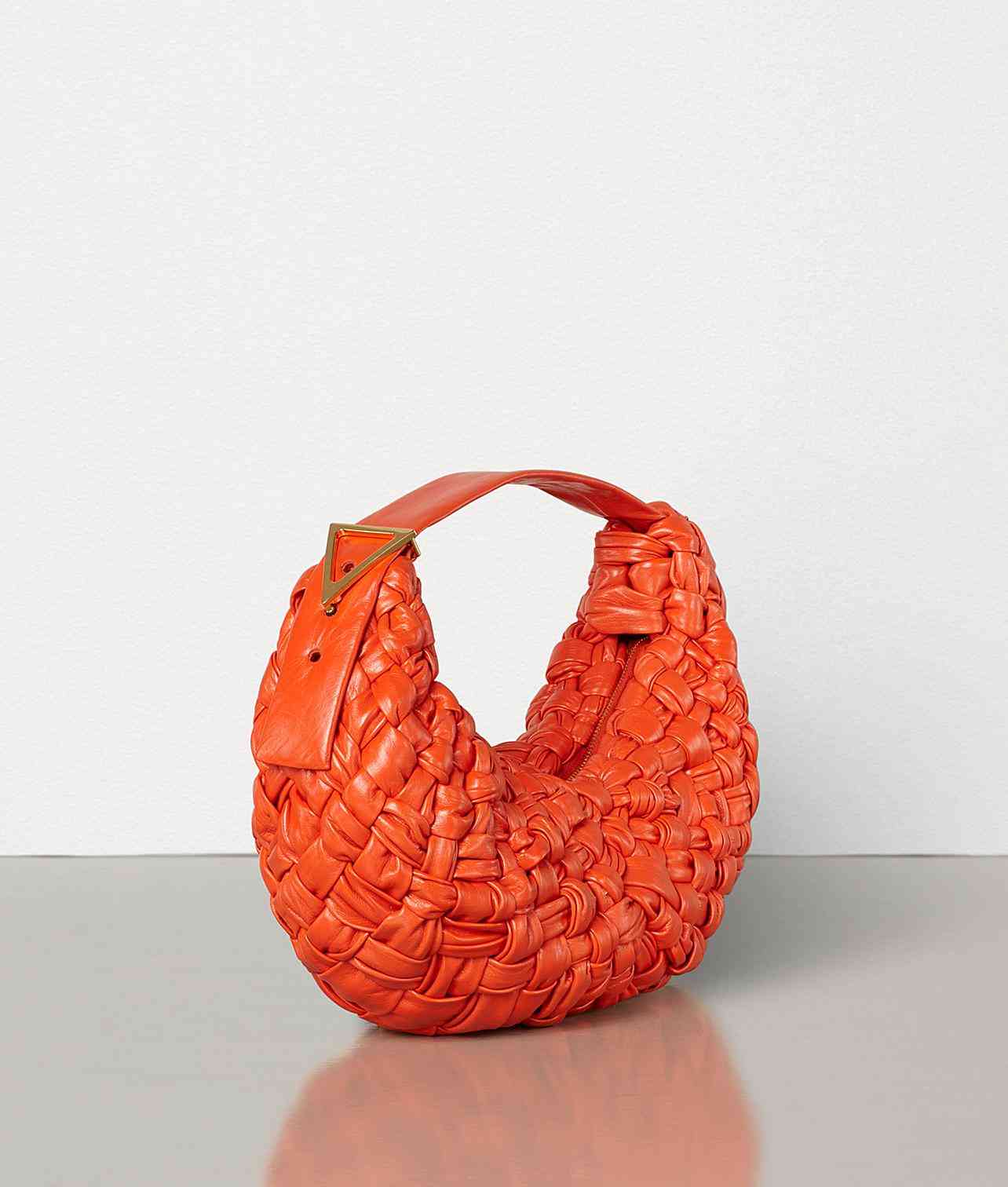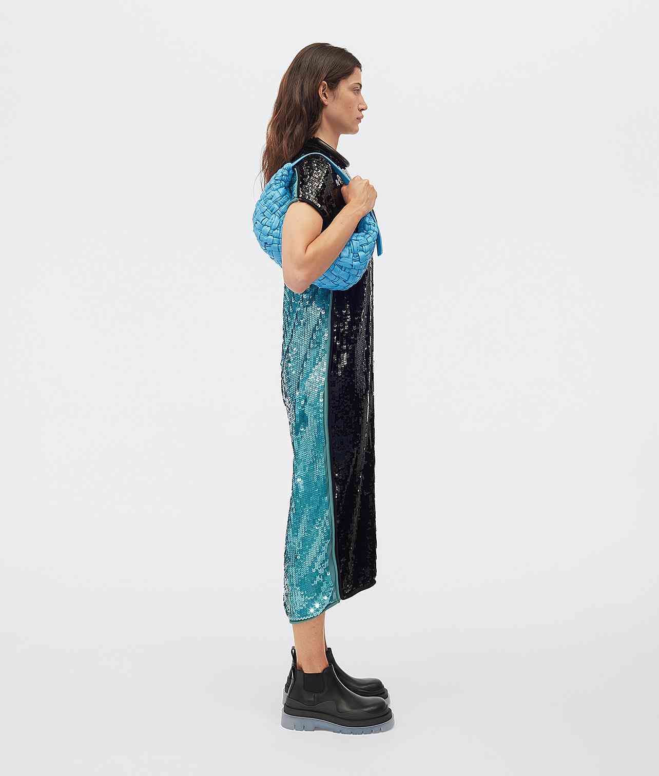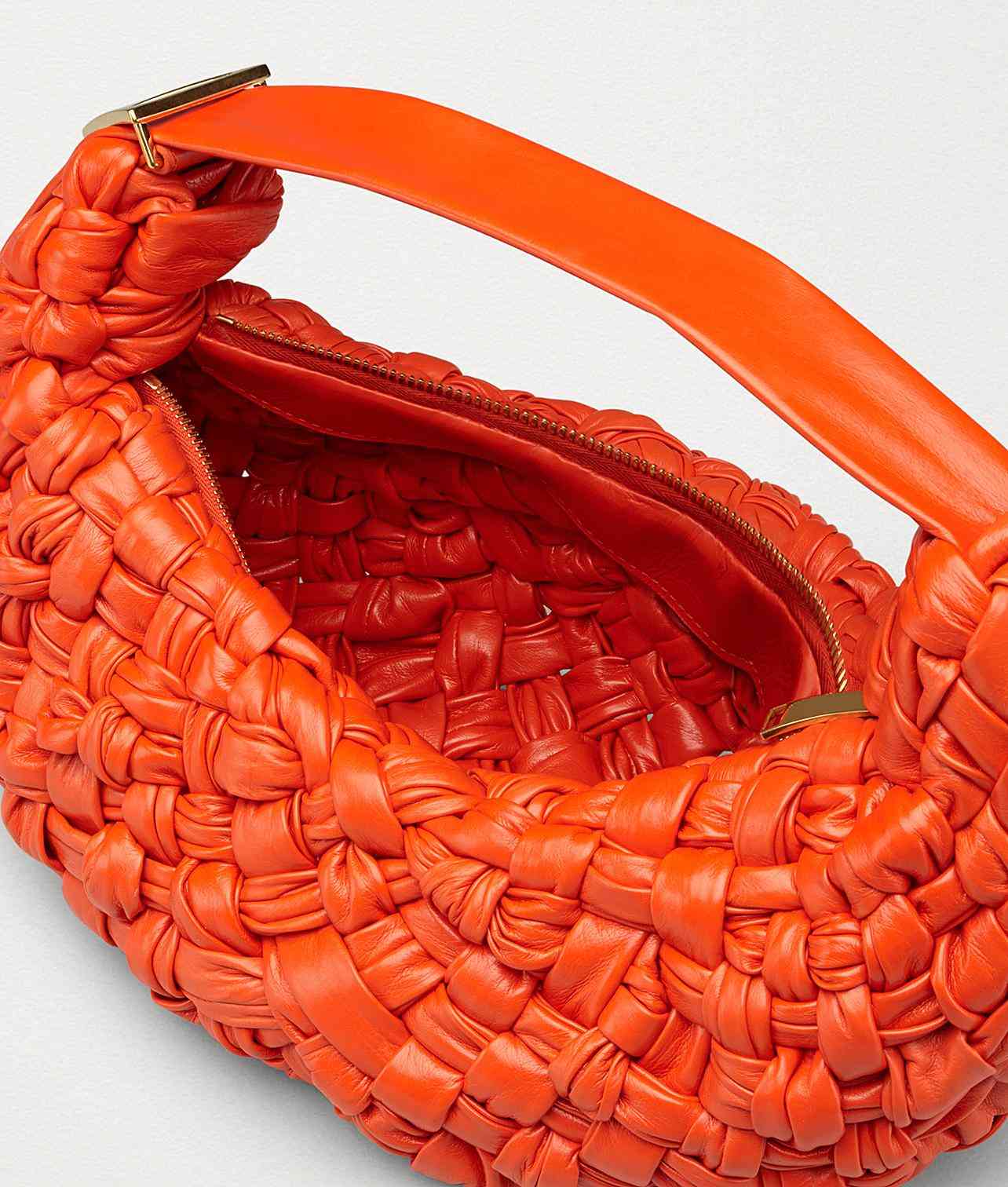 在此前Bottega Veneta多款包袋中常见的整齐且干净的Intrecciato编织技法在BV BANANA系列中被彻底打乱,混沌交错的皮革线条展现出了因打结而成的细微褶皱,使包袋外观更有力量感,其中的鲜红款近看更是有着一种像是被血液涂抹后的爆裂感。而在天蓝色青蓝色两款包袋中,这种别致的交缠设计却显得十分冷静,其表面看起来就像是堆满了冰块的荒原。