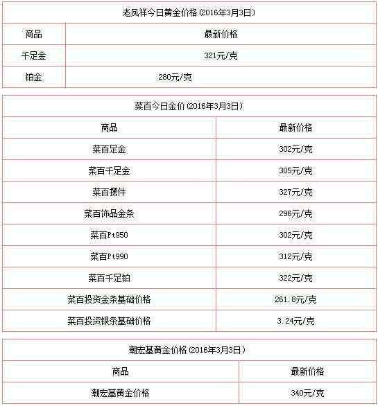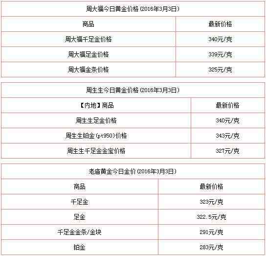 2016年3月3日今日黄金价格多少一克查询包括:周生生/周大福/六福珠宝/老庙黄金/老凤祥/菜百/太阳金店/潮宏基/金至尊黄金首饰价格查询。