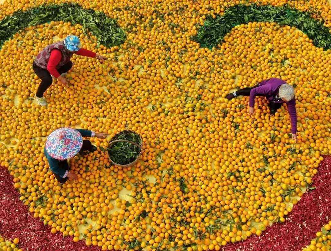 南阳淅川丹江大观苑桔林硕果累累,当地民众共同采摘蜜桔,并用桔子、辣椒、树叶拼出8米直径巨幅笑脸,分享丰收的喜悦。图/VCG