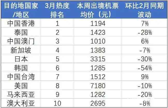 值得注意的是,新航季开启后,国际航班机票价格呈明显下降趋势。携程数据显示,本周以来,预订跨境整体机票均价为2481元,环比2月下降11%,其中出境机票价格降幅大于入境机票价格降幅,本周预订出境机票含税均价为2206元,环比降幅达到17%,而本周预订入境机票含税均价为2792元,环比降幅为5%。