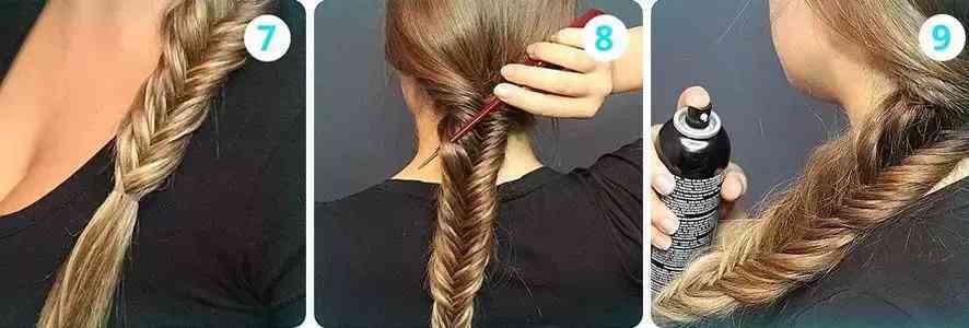 step7&8&9:用发圈扎起发尾固定,再用尖头梳子将头发弄蓬松,最后用定型喷雾固定一下。