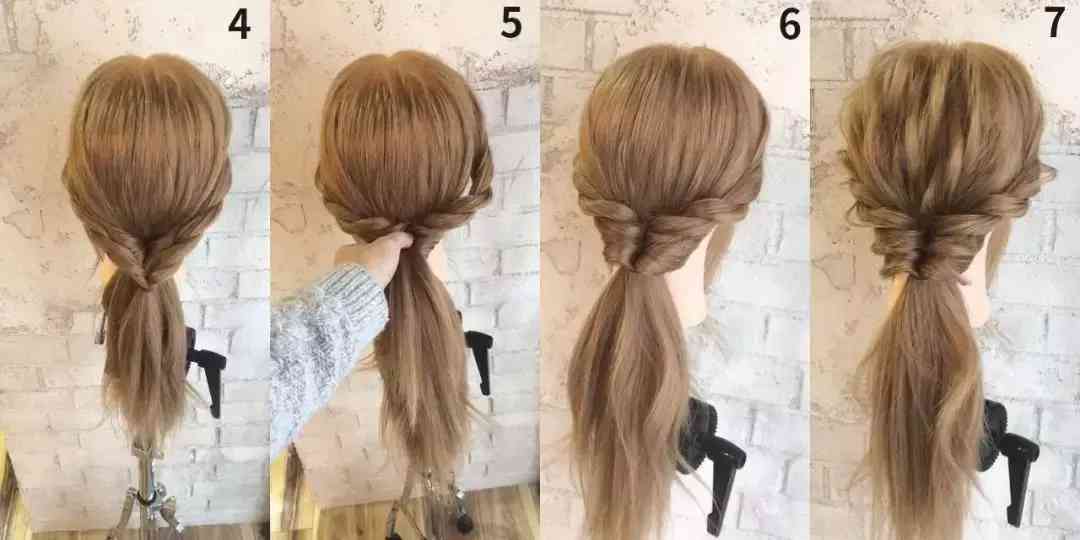 step4&5&6&7:将耳侧旋转成麻花的辫子扎起来,然后塞进那个洞里,就成了图6的形状,如果喜欢的话,可以将头发弄蓬松弄成图7的样子。