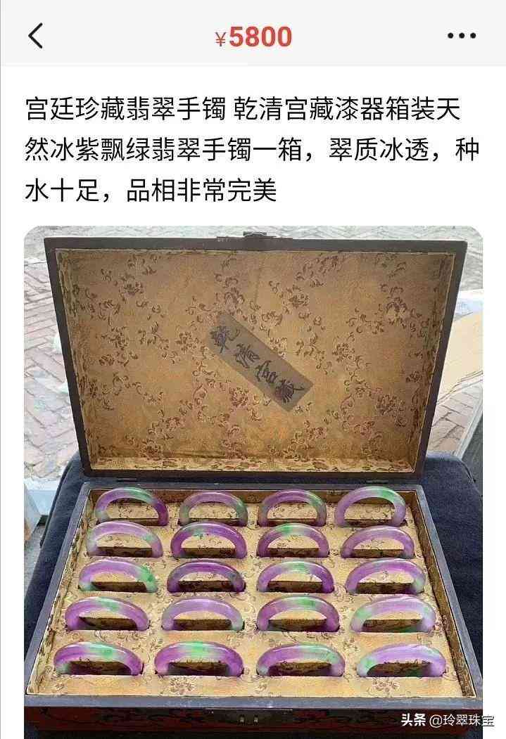 给玲姐记忆最深的就是下面这盒手镯,整整20只染色的春带彩手镯,还号称是“清朝乾清宫的翡翠珍藏”,每只5800块!