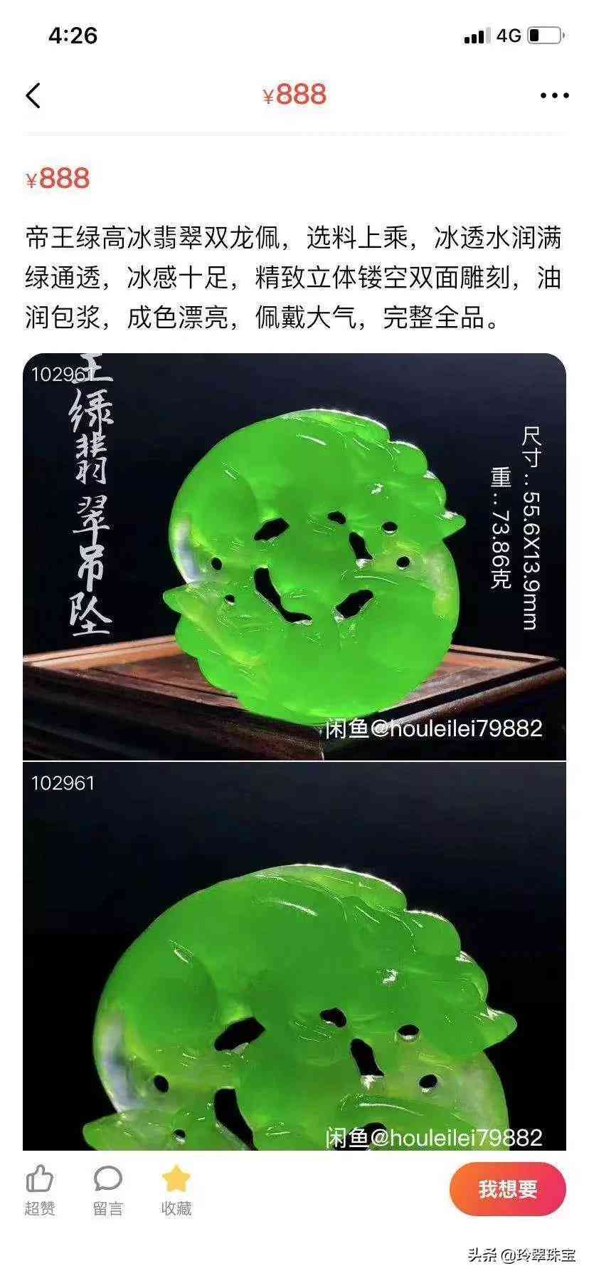 帝王绿翡翠是翡翠中颜色最好、价值最高的一种,一般只有在拍卖会上才能见到,不过在闲鱼平台上也出现了。比如说下面这块“帝王绿高冰翡翠双龙佩”,价格还特便宜,888元。