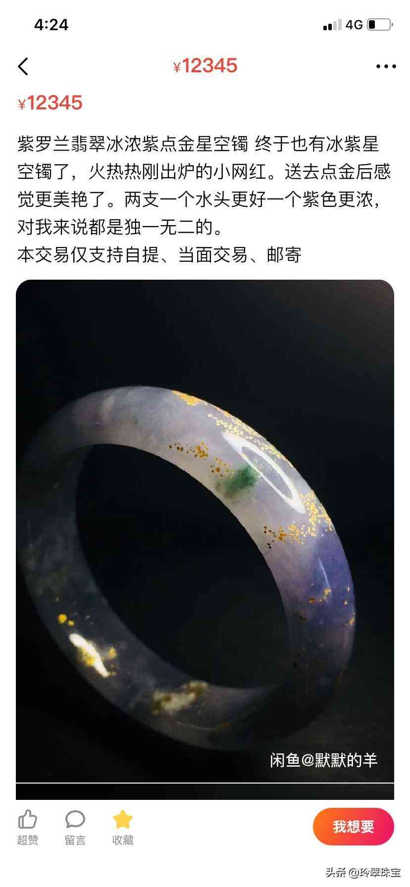 这只手镯的名字不错“紫罗兰翡翠冰浓紫点金星空镯”,样子也挺漂亮,标价12345元!不过再漂亮也是人工合成的,并不是天然A货,特别是镯面上的“洒金”,能假得再离谱点吗?