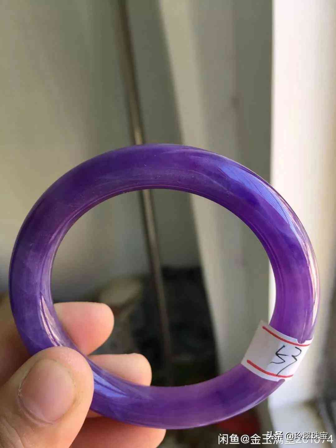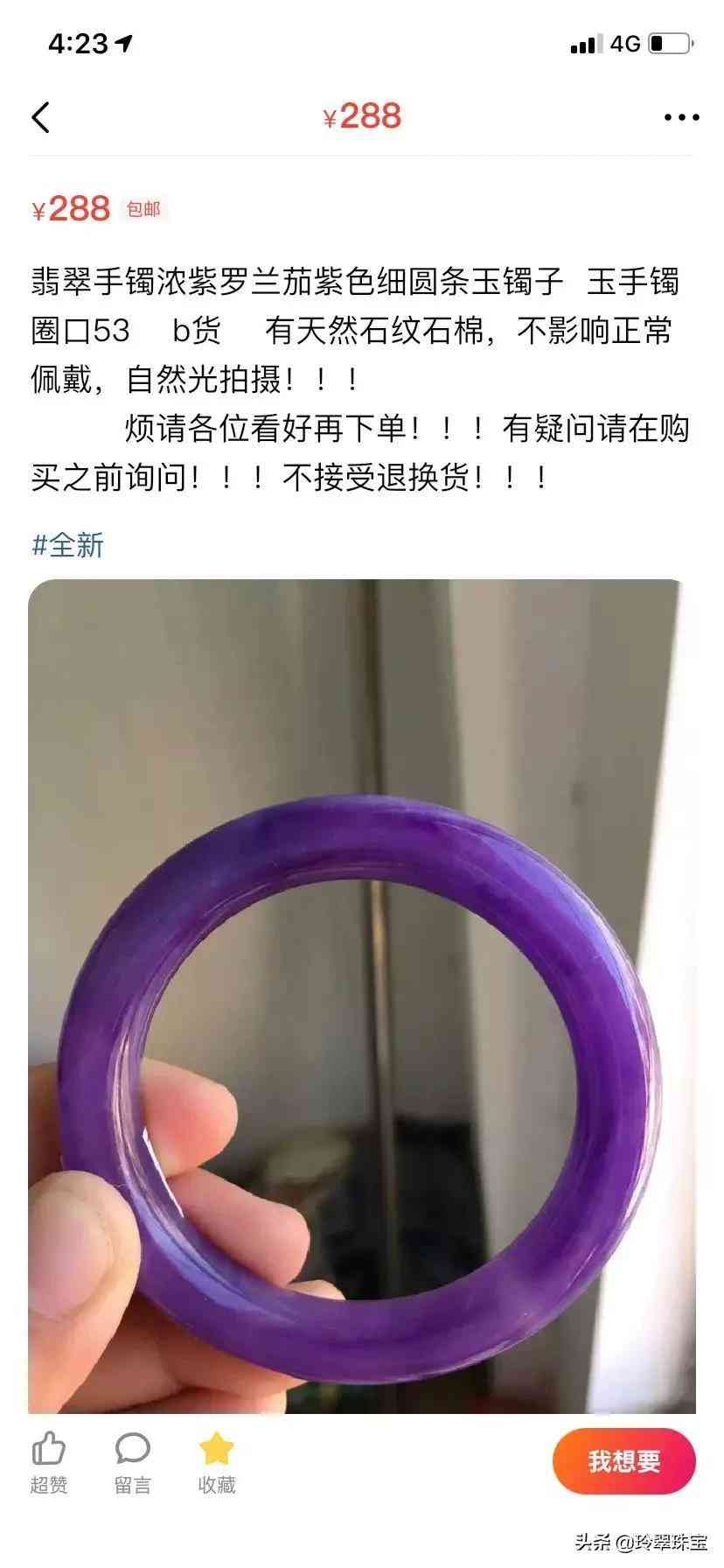 满色紫罗兰圆条手镯,53圈口,标价288块!这位商家比较实在,因为他在货品介绍里就说了:这是只B货手镯,正儿八经染色的!