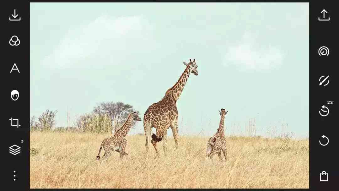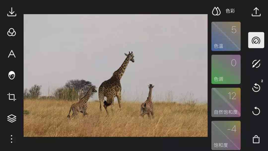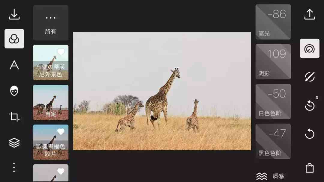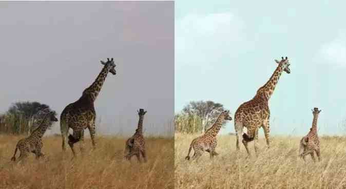 2.HSL调整,分别调整橙、黄、绿、青、蓝色的HSL,橙、黄、绿主要控制画面的长颈鹿与草地,青色主要控制天的色彩,蓝色为了避免天空出现多余色彩所以整体偏向青色!