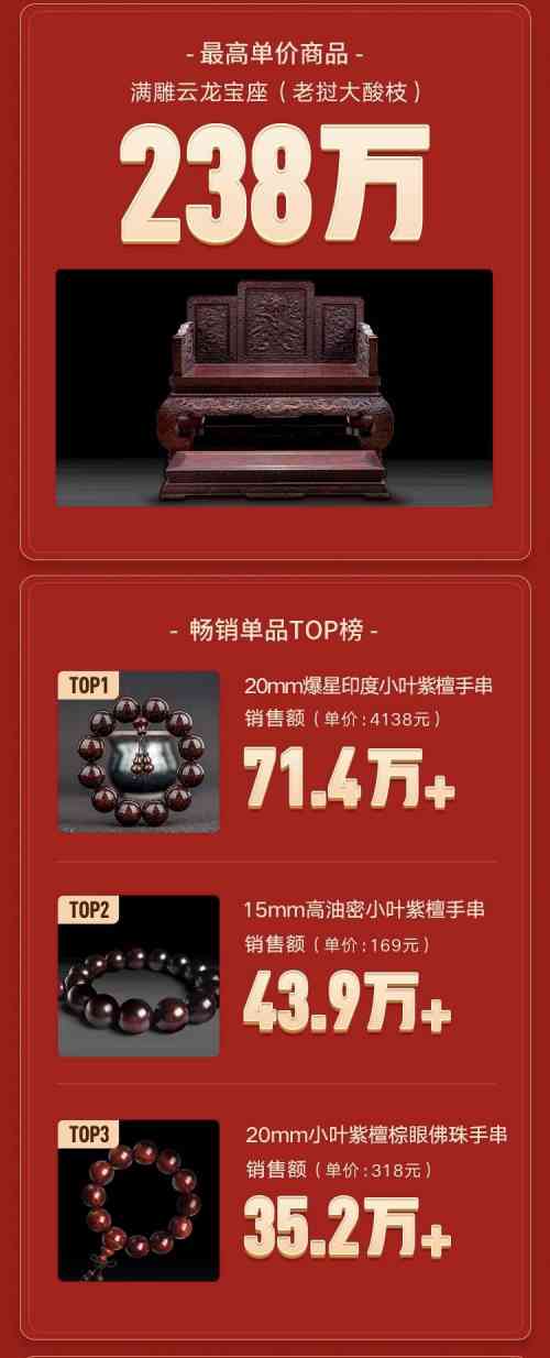 最终本场红木节活动销售额超过1205万,订单总量超8.4万单,累计观众数388万+。其中售出的最高单价商品为238万元的满雕云龙宝座(老挝大酸枝),该商品因明星成龙慈善晚宴一拍成名,又被称为“成龙宝座”。