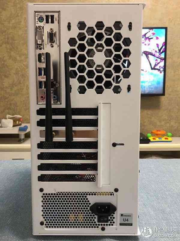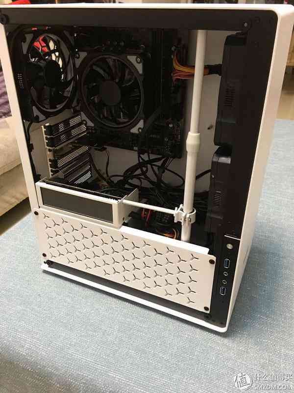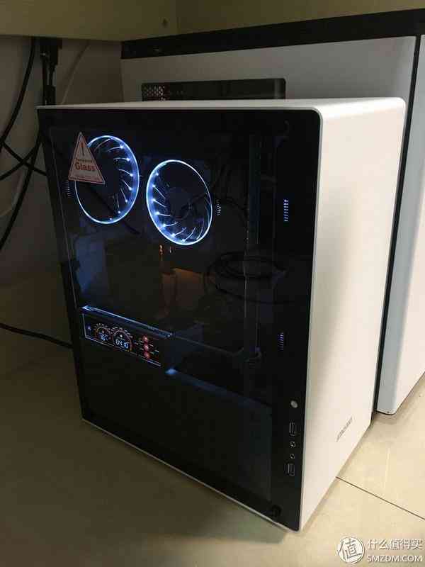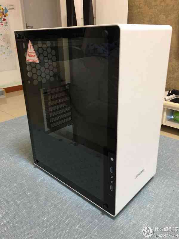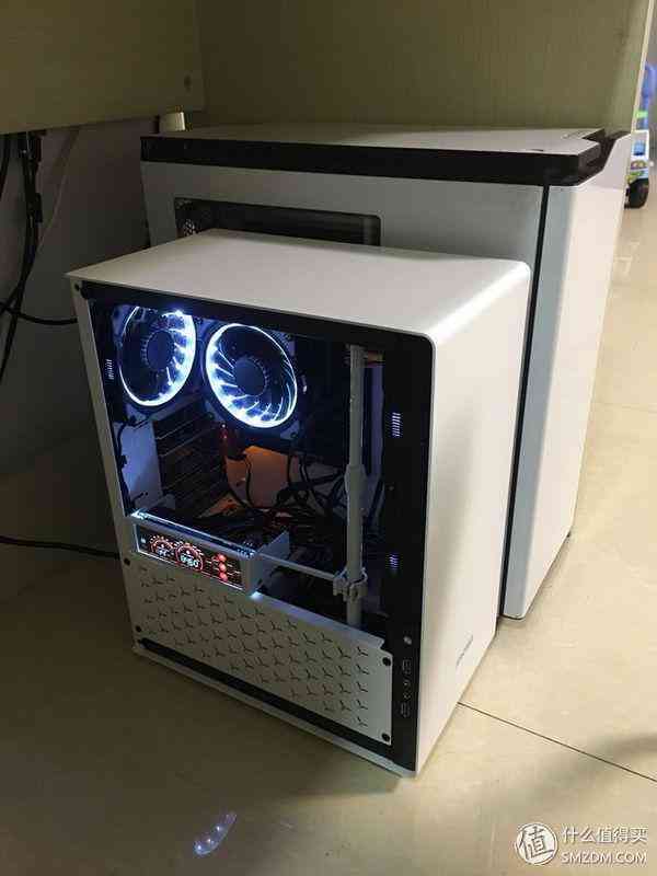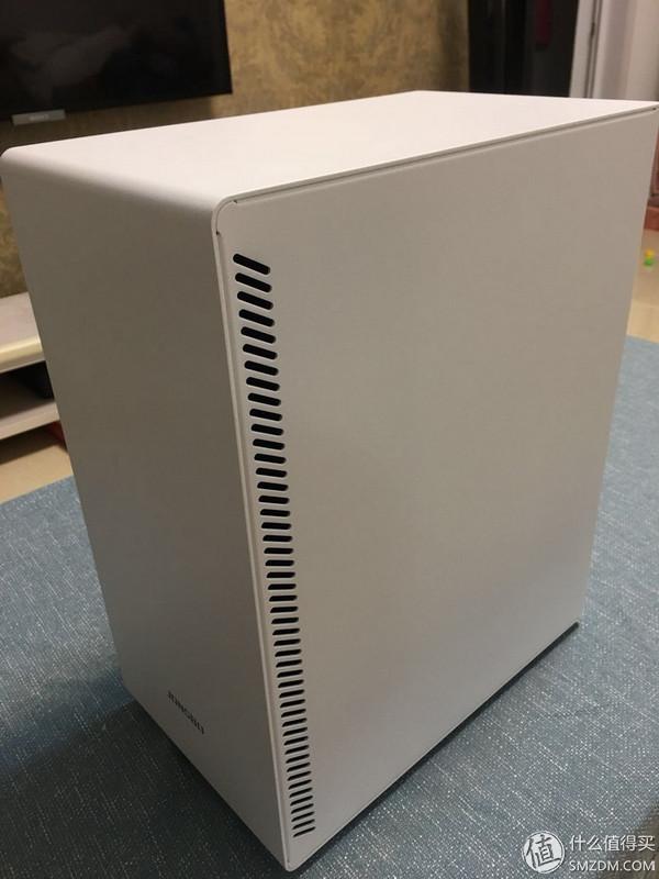 可以看到和小白的H440机箱比还是小了很多,但也实在算不上小,离ITX确实还有一定距离。。这个机箱我还是蛮满意的,原因有二:1. 岳父家的房门在机箱左边,屏幕和键盘在机箱右边,这个机箱是一个左透,那么进门的人一下就可以看到涡轮炫光,而岳父母坐在右边使用电脑时不会被光污染打扰;2. 价格合适,做工用料足,颜色也好看,纯白的没有一丝杂质