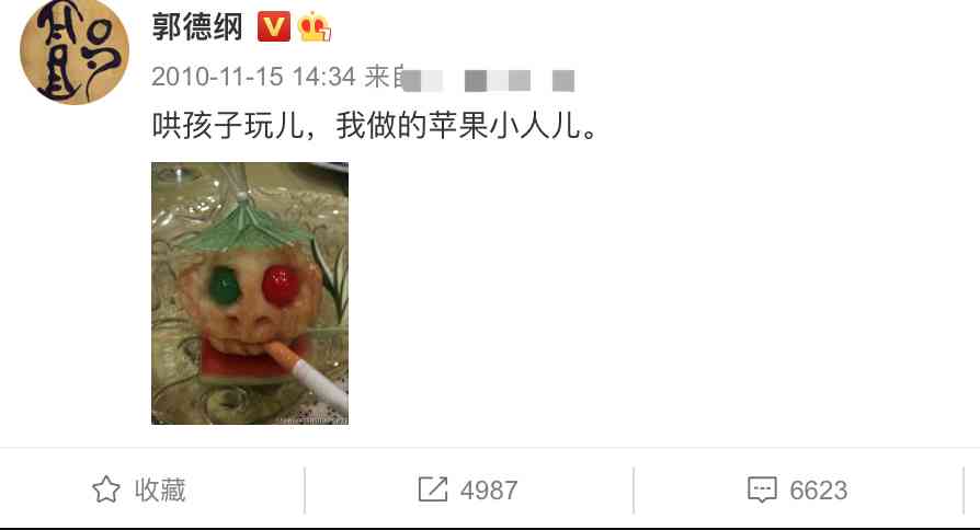 2010年,郭德纲吃完果盘,用剩水果给儿子扣了一个“骷髅”玩具——美其名曰“苹果小人儿”。