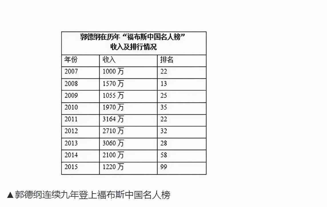 事业上,2015年,郭德纲早就大红大紫、连续9年登上了福布斯排行榜;