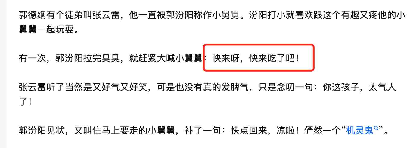 还有一次,郭汾瑒和小舅舅张云雷玩,玩到半路去拉臭臭,拉完就喊:“快来呀快来吃了吧!”
