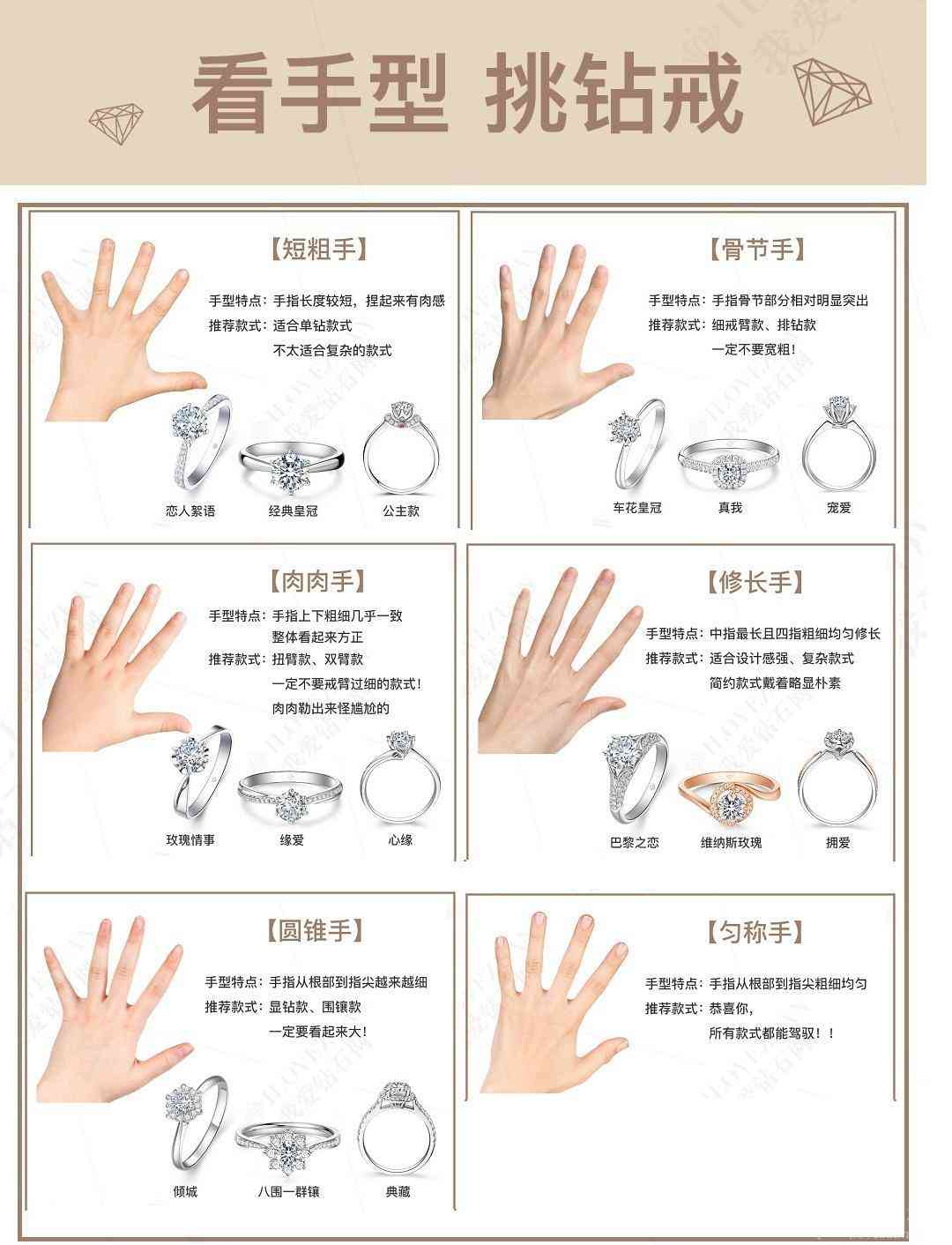 钻戒品质选好之后,可以关注一下款式方面,而要想达到比较好的佩戴效果,可以根据自己的手型选择合适的钻戒款式:
