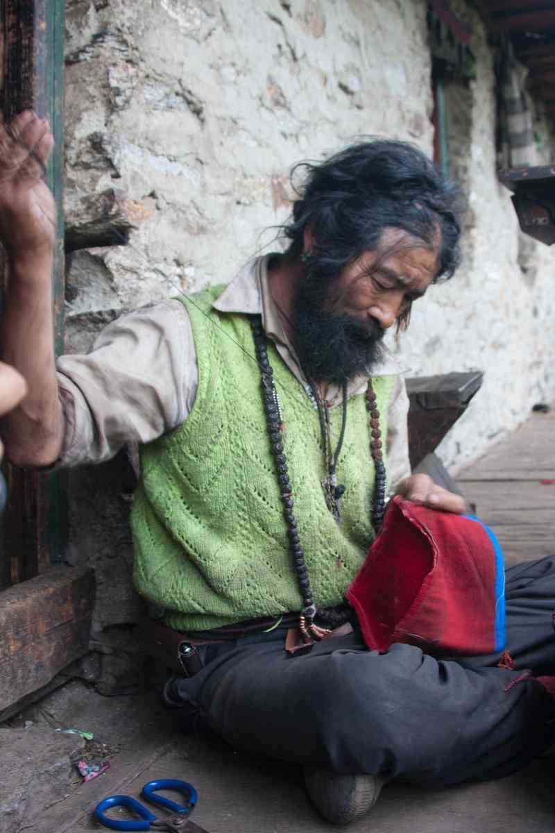 关于鞋子,洛坚老人保存着他年轻时穿过的一双,鞋底穿坏了,只剩上面的部分。鞋面用红色的呢布制成,有白色的线条点缀出简单的图案;鞋腰高约二十厘米,为素色的白呢布。这鞋子配上牛绒绳纳成的鞋底或牛皮底,就是藏族常见的松巴鞋——长筒藏靴。已过世的边巴喇嘛曾经是伟萨确林寺的主管,平时头戴老式的瓜皮帽,梳着尾梢缠有红绳的长辫子,脖子上挂着念珠,明黄色的衬衣外套着油亮油亮的红色抓绒夹克。虽然他年近八十,但不论天晴或是刮风下雨,始终光着一双大脚。对于自幼就赤脚上山下地的他,已经不习惯鞋子给双脚带来的束缚。