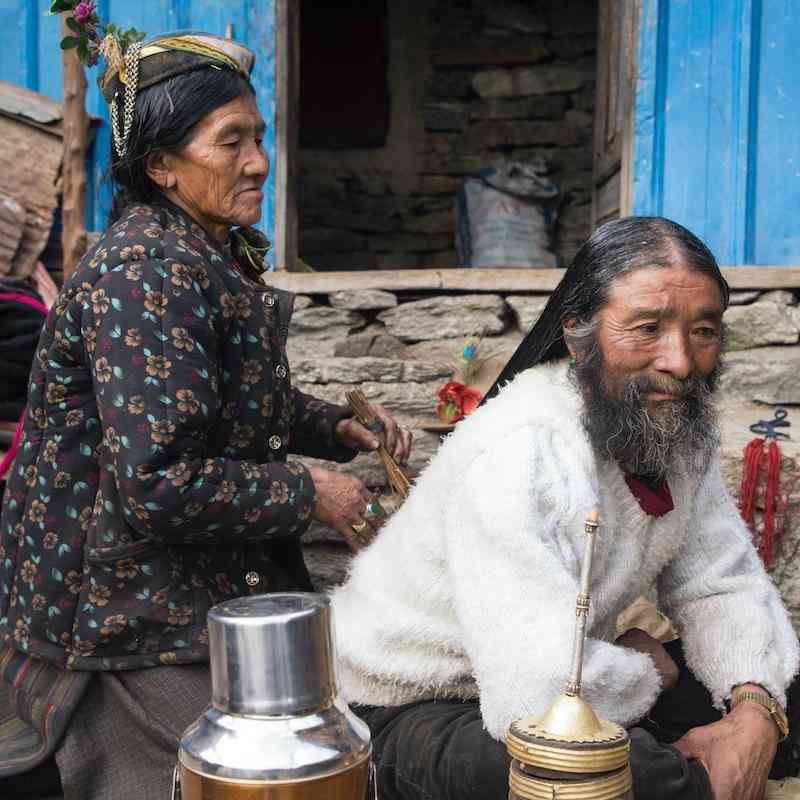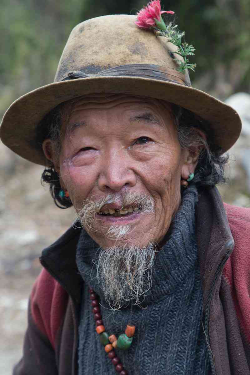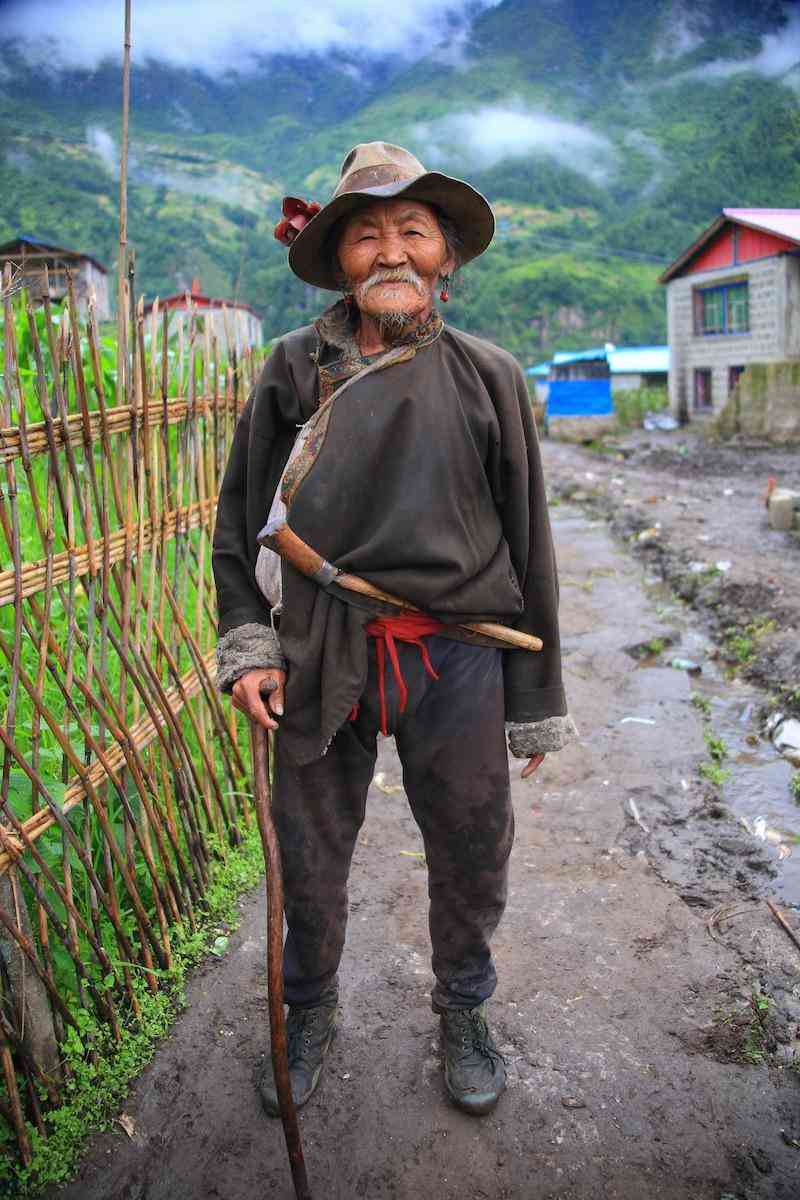 除了腰佩棋刀,相对于妇女还能保存着相对原生态的服饰,男性夏尔巴就没有那么幸运了。制帽师多吉平措平时都穿着汉式服装,梳着一个大辫子,戴侧插着花朵的灰黄色呢绒帽——若从服饰上看,较汉族并无特别之处。老镇长拉加脖子上挂着绿松石、红瑚珊与玛瑙珠配成的挂饰及法师的护身符;手上戴着粗大的尼泊尔镶宝石戒指;长发梳成一条长辫,头顶左侧戴着插着花朵的毡帽。他2009年在尼泊尔订做了一套上装,与以前的服装特别相似,由立领斜襟右衽棉麻材质的藏式衬衫与对襟无领无扣的牦牛绒长坎肩组成,衬衫的立领与长坎肩的周边都缝有绸缎的边饰,显得华贵。