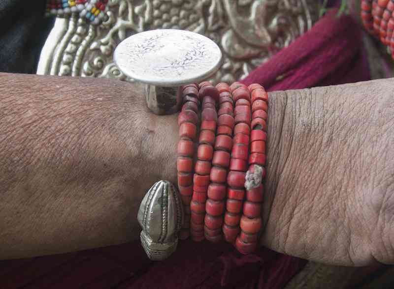出于对珍贵珊瑚的喜好,在陈塘还有产自尼泊尔被称为垛期鲁的红色料珠,它意为石头珊瑚,为真珊瑚的替代品,按对出售。时代变迁,很多珠饰与银币都变成了仿制品,不过在有条件的家庭中,货真价实的华美珠饰,还是值得信任的财富;而且一个家庭经济的好与坏,也完全可以在主妇身上佩戴的珠饰上体现出来。