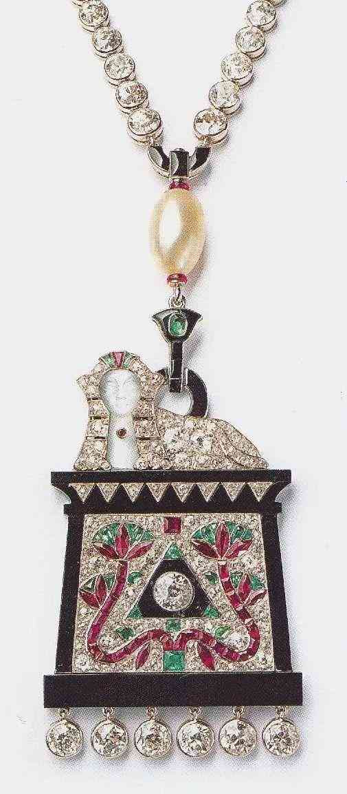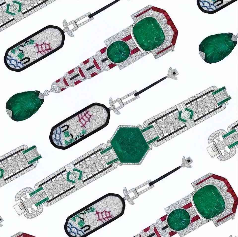 Art Deco 风格中的埃及文化、远东文化都让卡地亚痴迷,其中,在中国风的影响下,卡地亚开始在珠宝中使用了翡翠和珊瑚,翡翠比之祖母绿颜色更暖一点儿,珊瑚的红色要比红宝石柔和一些,于是,卡地亚让这四种宝石互通速配,对纹样、颜色的匹配考虑得更细致。