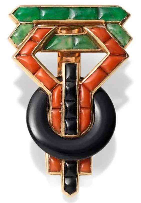 Art Deco 风格胸针 翡翠、珊瑚、缟玛瑙 约 1925 年