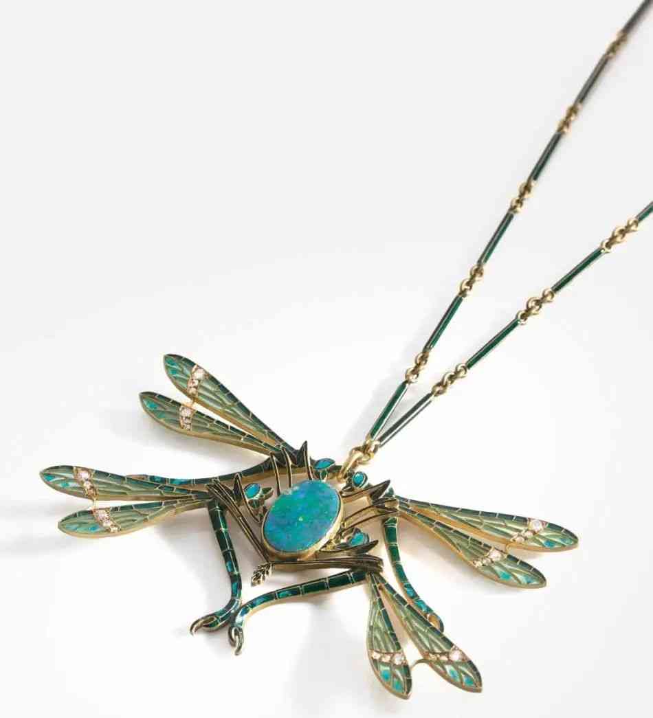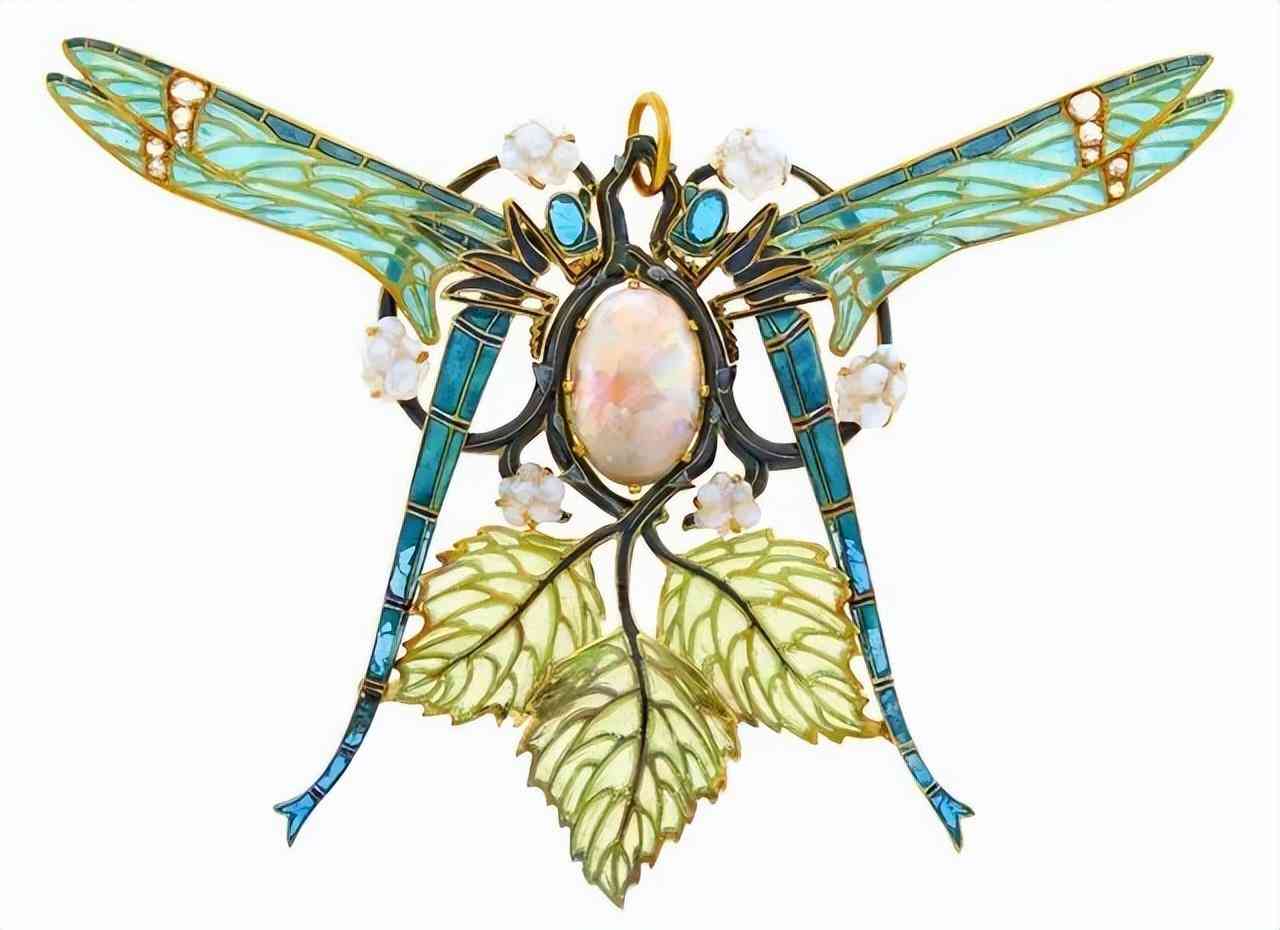 新艺术运动的代表珠宝大师 René Lalique 就很快发现了这个组合的魅力,大家都知道这位设计师是出了名的选材不拘一格,玻璃、牛角等都能成为珠宝的主角,更别说是自带神秘背景的欧泊本身就非常吸引这位象征主义大师。