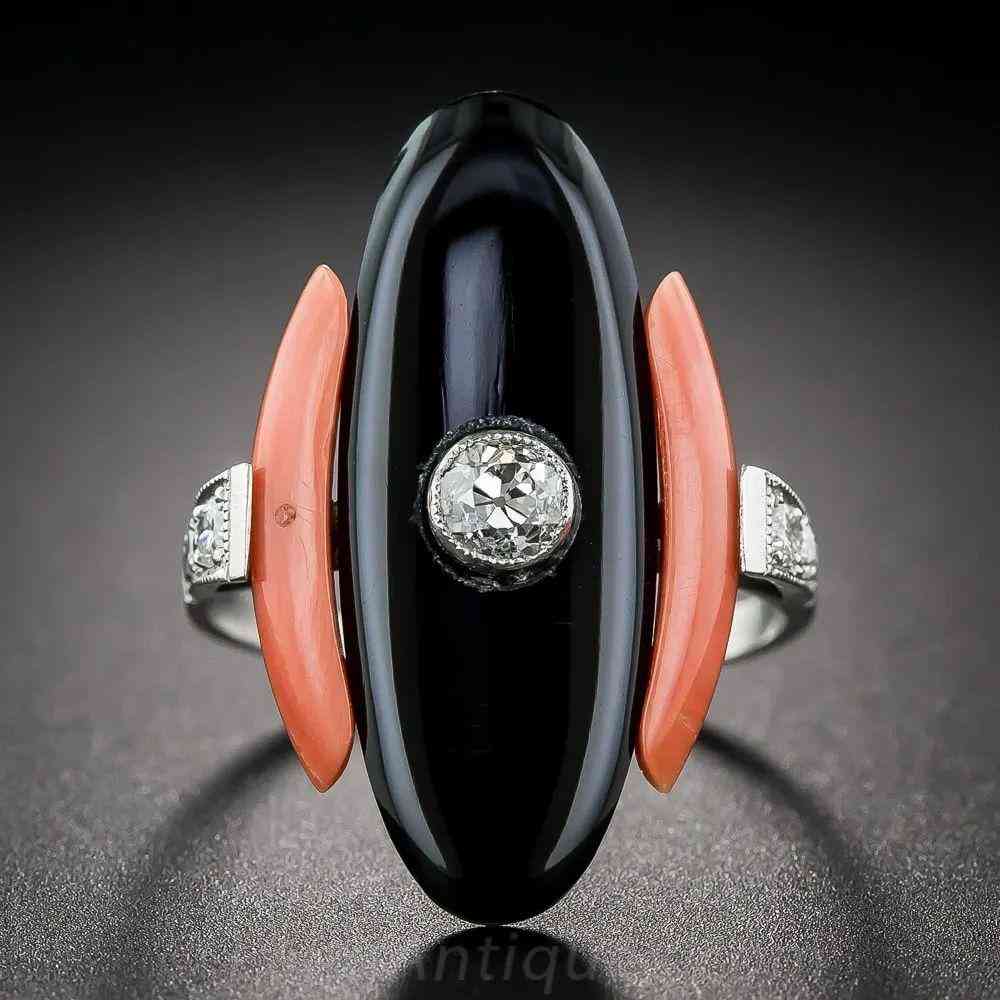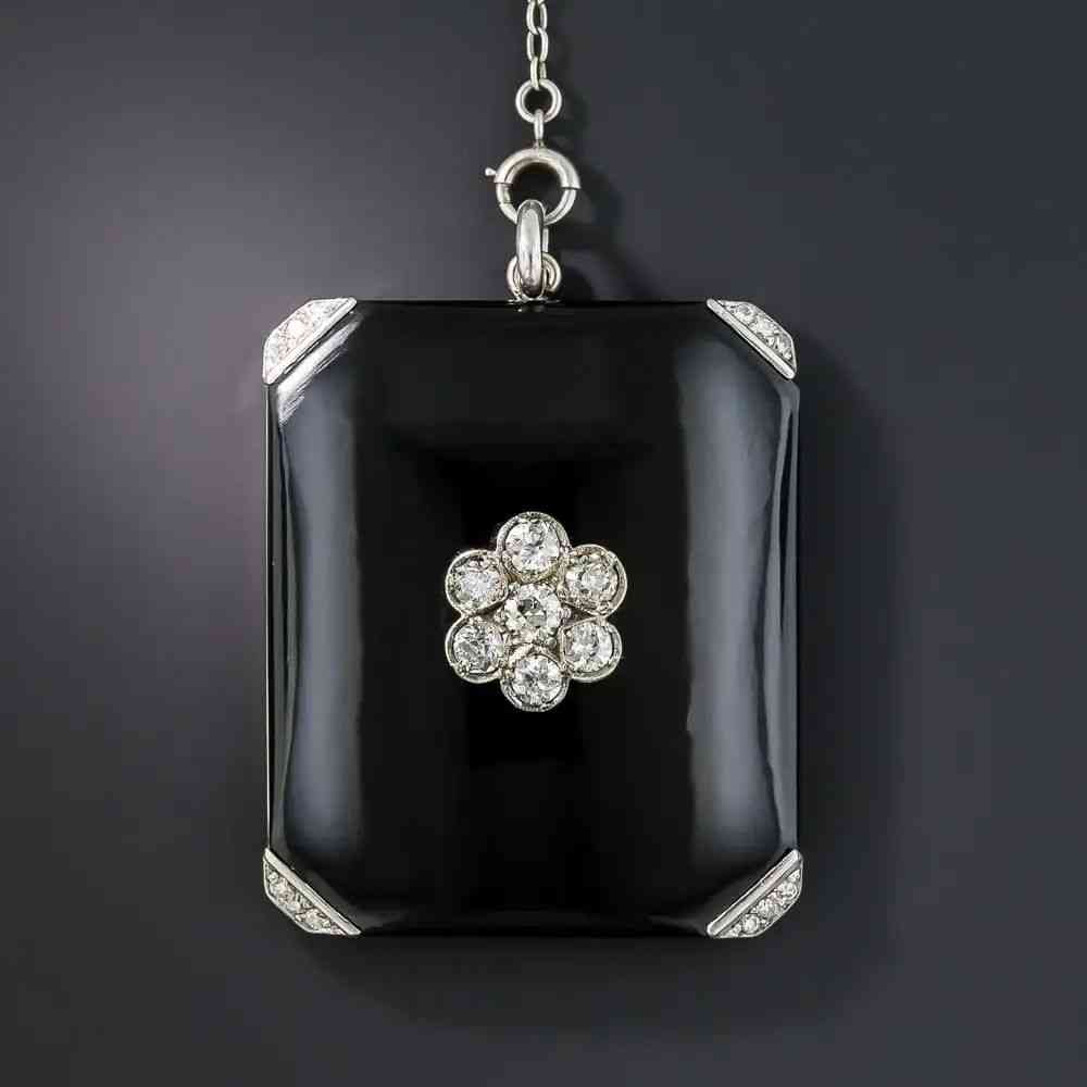 缟玛瑙是纯黑色的玛瑙,在哀悼珠宝时期,它大都被做成抛光板,成为珠宝的主材,钻石则负责构成图案和设计的亮点。到了 Art Deco 时期,它也有时做为“大背景”,但更多时候是作为勾勒强调的线条,负责让红宝石、祖母绿的对撞色彩沉稳下来,强调整件作品的线条感,它和钻石一明一暗两条线为珠宝营造了阴影与高光的立体感。