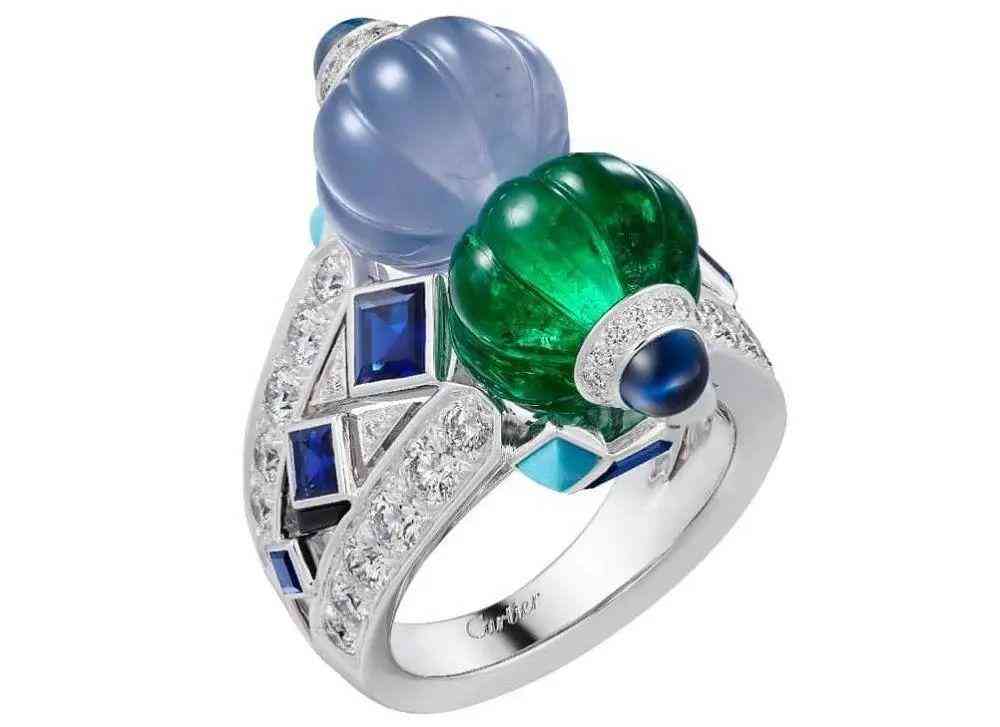 1911 年雅克·卡地亚的印度之旅为这对经典拍档成为传奇拉开了序幕,印度传统的鲜艳配色和宝石雕刻技艺被他带回了巴黎。他选择了让祖母绿和红宝石 C 位出道,用钻石和缟玛瑙为其作配,古朴的雕刻纹样和鲜艳的撞色带来强烈的异国情调,却又被 Art Deco 的简练几何线条重新包装,焕发出不一样的光彩,成为上世纪初最让人印象深刻的珠宝杰作。