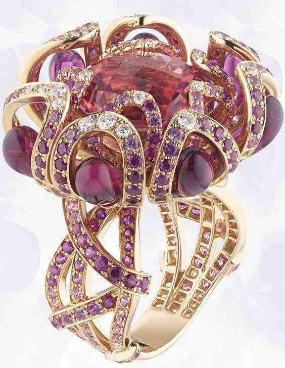 还有些设计师让碧玺和其他贵宝石结合是采用了取长补短原则,比如尚美巴黎选择红色碧玺与红宝石匹配,完美地回避了红宝石尺寸的问题,将大 Size 的红色碧玺当做主石,用小颗红宝石的浓郁鲜艳色泽为作品点睛。