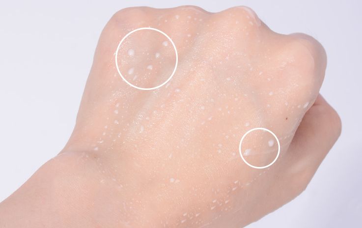 抹在手上几秒后,就会爆出细密的水珠,再抹两下就被皮肤完全吸收了,双手像是喝饱了水,润润的!