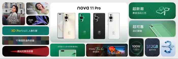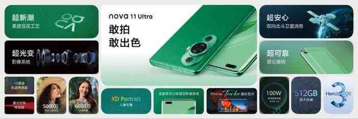 ●华为nova 11系列:主打“敢拍敢出色”这次华为nova 11系列新机以前卫大胆的时尚设计,人像大片的优异表现,智慧便捷的使用体验,为年轻人打造焕然一新的nova“星宇宙”。配色方面,nova 11系列此次提供了11号色、曜金黑、雪域白以及晨曦金共四款颜色。其中,nova 11 Ultra和 nova 11 Pro 的11号色与曜金黑配色,采用手机业界首创星耀素皮压花工艺,辅以小荔枝纹为细节,达到触感细腻且兼具实用、耐摔、耐磨特性。同时,在nova 11系列上首次采用了昆仑玻璃,昆仑玻璃通过复合离子强化注入,生长出亿亿个纳米晶体,使得玻璃的韧性获得大幅度提升,日常使用更可靠、还更耐摔耐用。