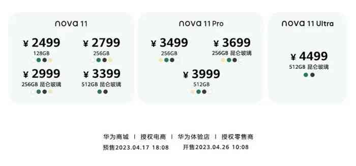 最后来到价格部分,华为 nova 11售价2499元起,Pro版售价3499元起, Ultra版本售价4499元。将于4月17日18:08分开启预售, 4月26日10:08分正式开售,用户可登陆华为商城及各大授权电商平台或前往华为体验店、华为授权零售门店进行购买。