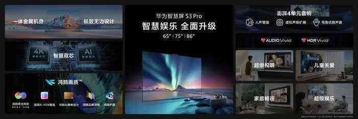 ●华为智慧屏S3 Pro 全新升级家庭电视场景智慧体验华为智慧屏 S3 Pro,在产品性能、画质、智慧体验上实现多方位提升。它搭载全新智慧双芯,包括4K旗舰主芯和AI视觉芯片。同时升级儿童关爱、家庭畅连和超级娱乐等多方面智慧功能体验。