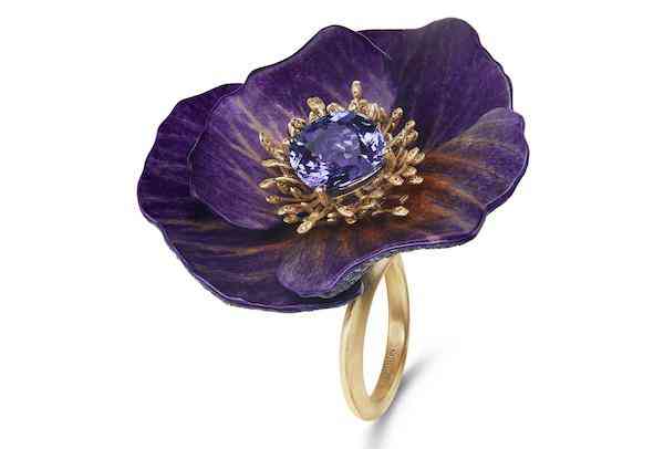 Anémone Néron Bordeaux 银莲花戒饰以羊绒般细腻的黄金花蕊,嵌以 5.99 克拉的紫色蓝宝石,令人想起参差百态的花瓣之美。底部密镶以黄色和蓝色蓝宝石的设计令作品色彩更为丰富饱满。