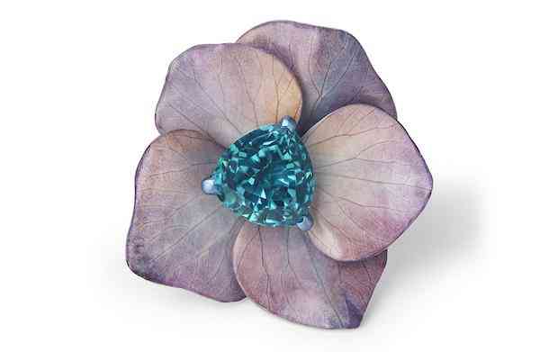 Hortensia Violet Bleu 绣球花戒中间凸起的蔚蓝宝石为一颗 8.7 克拉的蓝色碧玺宝石密镶以钻石,花戒底部则饰以紫色和蓝色蓝宝石。