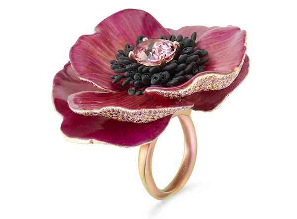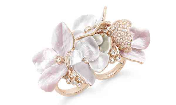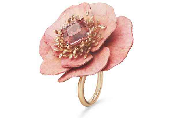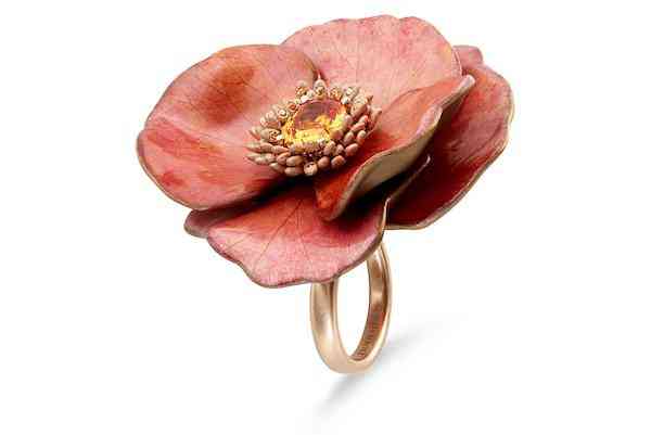 鲜花的美艳外表会随着时间的流逝而黯然失色,短暂的花期使得鲜花无比珍贵。然而在今年推出的多款独特的花型戒指中,鲜花花瓣以独特的保鲜技术封存,得以完美地保留其鲜花的质地、轻盈感和天鹅绒般的光泽,而且不易破碎。在这些花瓣的簇拥下,令镶嵌帕德玛蓝宝石、锰铝榴石、蓝色碧玺和浅黄钻石等非凡宝石的花型珠宝也相形见绌。