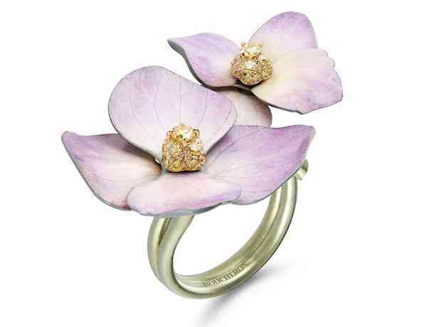 Hortensia Rosita 绣球花戒与它的两朵花冠均饰以精致小巧的黄钻花束,黄钻的点缀照亮了光影流转的花瓣。