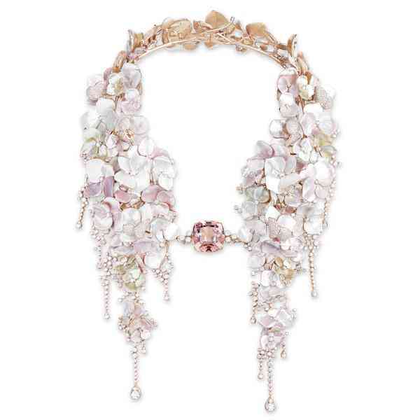 宝诗龙的珠宝工匠没有忘记绣球花的夏日风景,以精巧的工艺打造出绣球花的绮丽美态。在Nuage de Fleurs 花云项链上,玫瑰金材质饰以珍珠、密镶钻石和 42.96 克拉的枕形切割粉色碧玺。工匠通过技术,扫描绣球花的每一片花瓣,将扫描成品置于项链之上,汇聚形成栩栩如生、随风翕动的花云设计,为项链带来精致而富有诗意的韵味。花朵的曲线、褶皱与精致而柔美的珍珠搭配和谐,彰显出匠心独运的原创技术。