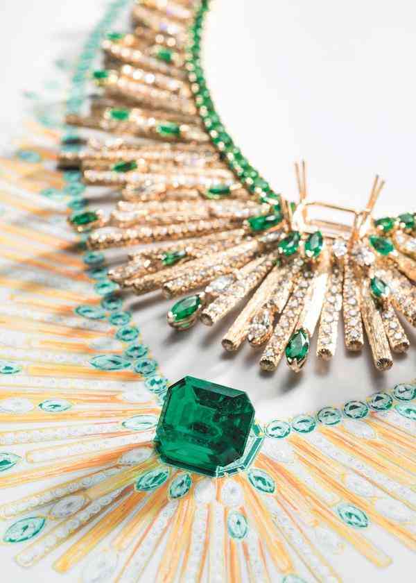 在Sunlight Escape系列的Midnight Sun主题项链上,祖母绿与钻石的光芒交织流转,将 Sunlight Escape “源于阳光的爱”的精神表达得淋漓尽致。这条18K玫瑰金项链上,镶饰1颗来自哥伦比亚的祖母绿形切割祖母绿(约6.02克拉),35颗马眼形切割祖母绿以及119颗圆形切割祖母绿,而42颗马眼形切割美钻和219颗明亮式切割美钻则栩栩如生地展现出烈日的光彩。