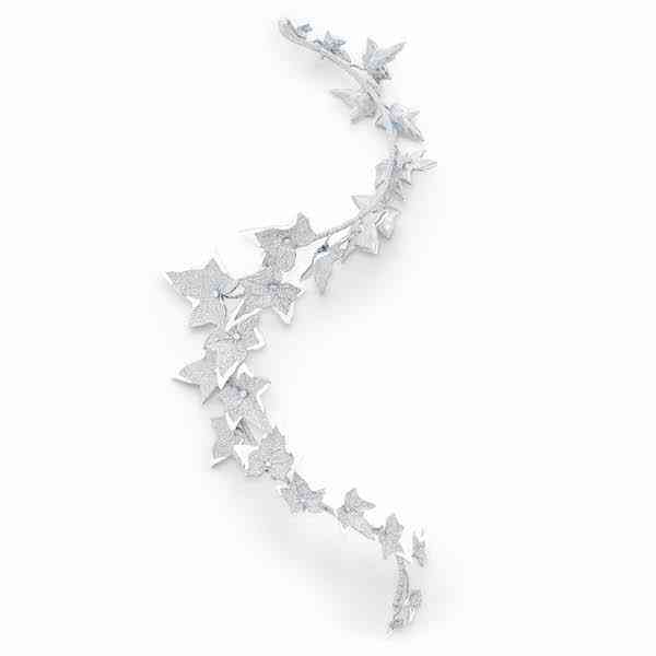 值得一提的是,工匠选用真实的常春藤枝条取代传统的绘制图稿:扫描常春藤枝叶,将数字化的常春藤图像围绕于模特的脖颈之上,这样模拟设计得来的珠宝作品不仅保留了植物形态的每个细节,还有着引领潮流的冠形项链设计。Lierre Givré 融霜常春藤的枝干部位微镶以钻石,略微晃动项链,常春藤叶便随之轻轻摇动,仿佛柔和的微风拂叶而过。