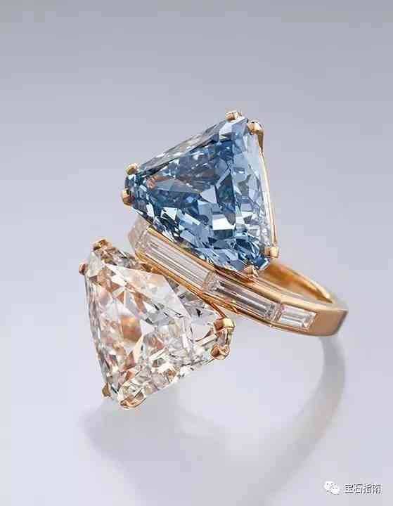 2010 年 10 月,纽约佳士得将此款独特的双宝石钻石戒指进行了拍卖,最终的中标价格为 1,576 万美元。这枚戒指嵌有一枚重 10.95 克拉的艳彩蓝钻(宝格丽蓝钻,自然色,净度为 VS2)和一枚重 8.87 克拉、净度为 VS1 的 G 色钻石,这两枚钻石的外观均为三角形。